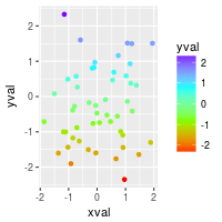 ggplot(df, aes(x=xval, y=yval, colour=yval)) + geom_point() +